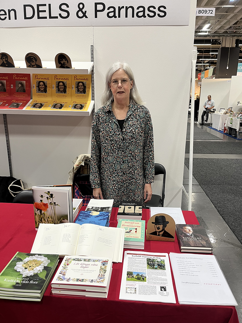 Bilden: Anna Nordlund, styrelseledamot i Karlfeldtsamfundet, i DELS monter.