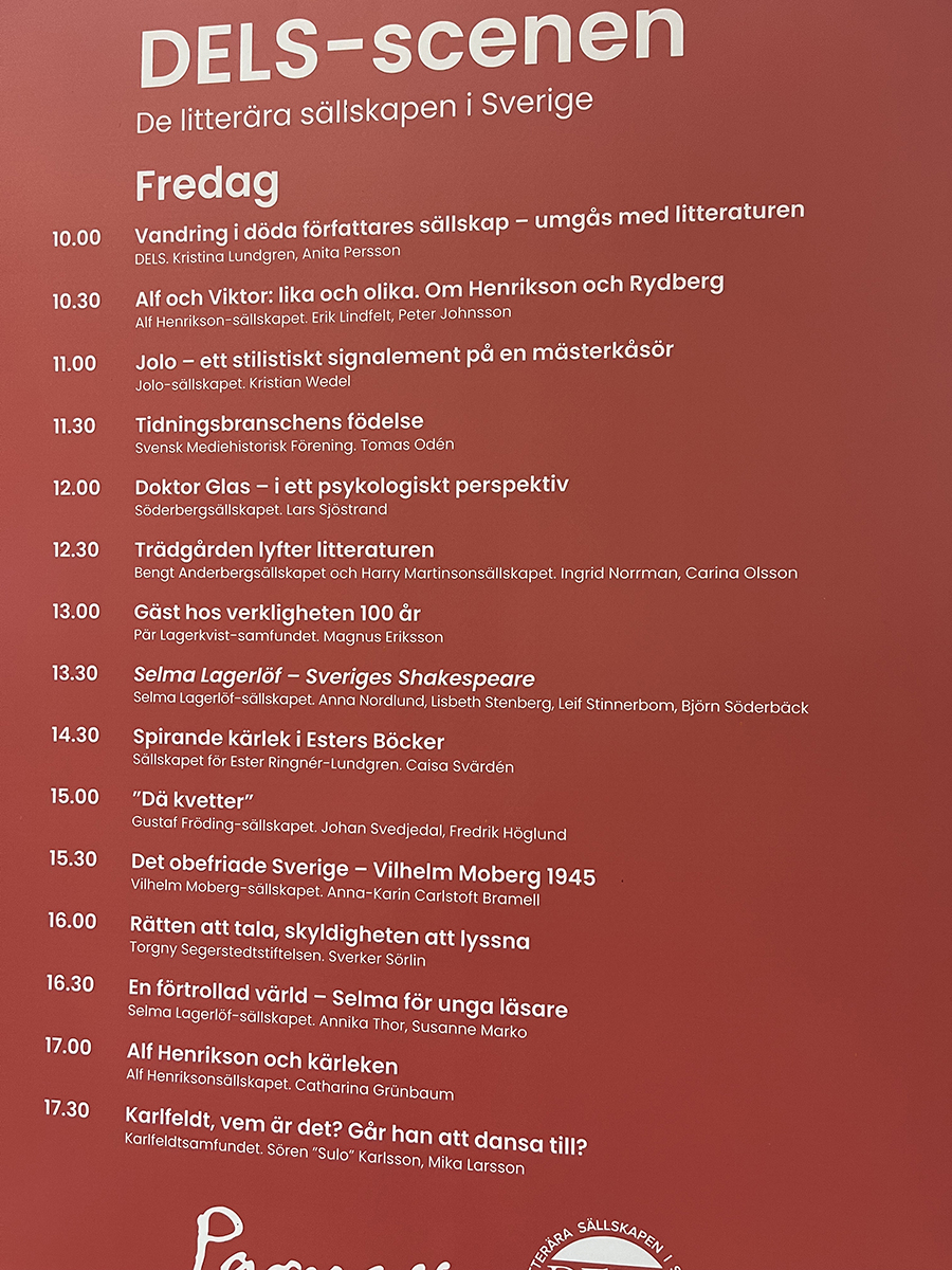 På DELS-scenen blir det en hel timmes Karlfeldtprogram 17.30 till 18.30 med Sören ”Sulo” Karlsson och Mika Larsson under rubriken: ”Karlfeldt, vem är det? Går han att dansa till?” En av svensk populärmusiks mest hyllade låtskrivare, fenomenet Sulo Karlsson, skickar ut Karlfeldt på dansbanan med Larz-Kristerz. Sulo samtalar om tonsättningarna med poetens barnbarn, f.d. journalisten och kulturrådet Mika Larsson.