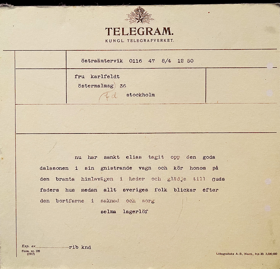 Både som poet och som ständig sekreterare i Svenska Akademien var Karlfeldt mycket uppskattad av Lagerlöf. Karlfeldts död 1931 kom som en chock för Selma Lagerlöf, liksom för hela Sverige. Karlfeldtsamfundets Gunbritt Berggren deltog i publiken och förmedlade det telegram från Selma Lagerlöf till Gerda Karlfeldt som Anna Nordlund läste upp och som Lagerlöf skickat omedelbart när hon fått reda på att Karlfeldt var död. Texten lyder: Nu har sankt Elias tagit opp den goda dalasonen i sin gnistrande vagn och kör honom på den branta himlavägen i heder och glädje till Guds faders hus medan allt Sveriges folk blickar efter den bortfarna i saknad och sorg.
